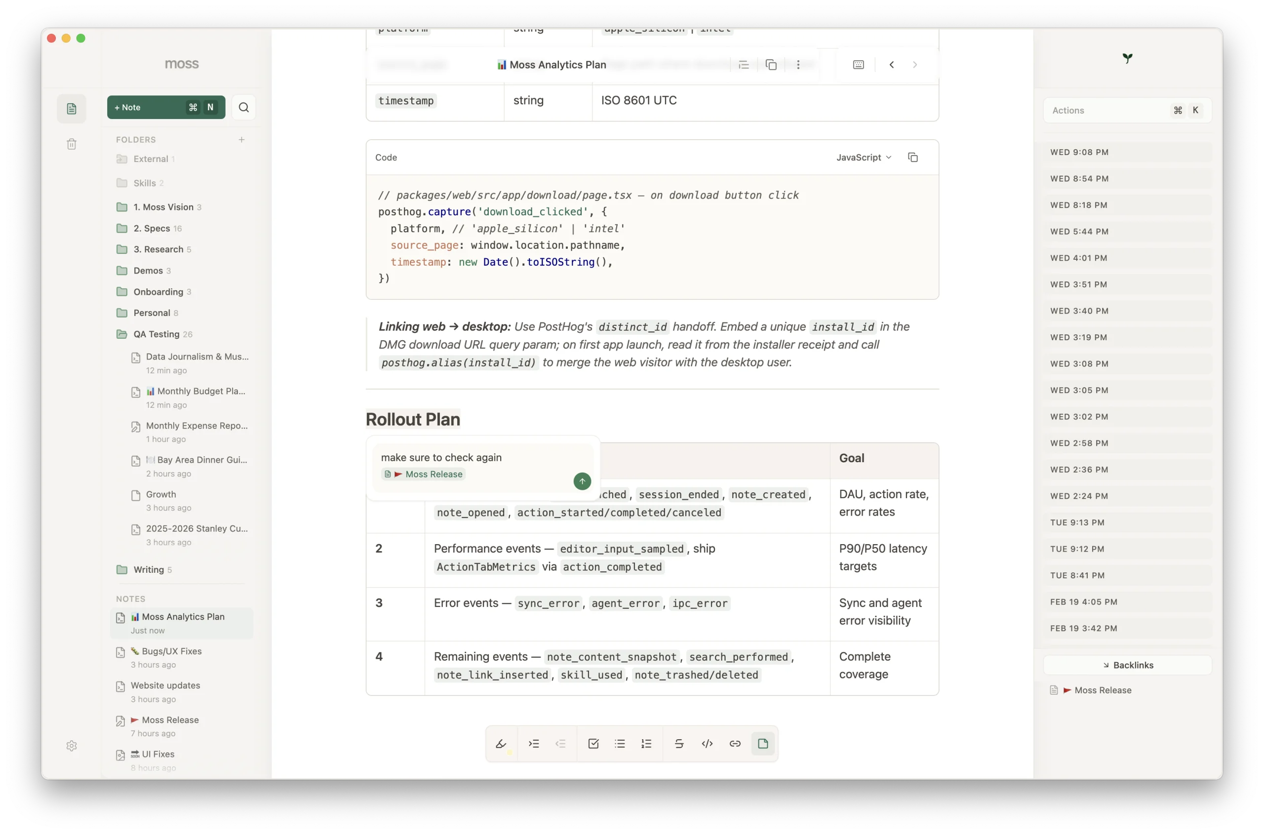 Give Moss access to any folder or file in Settings — like a codebase, a research archive, or a project directory. The agent can instantly read and search everything inside. Type @ in Actions to mention a directory, and the agent brings it into the conversation. Ask questions about your code, plan features from existing specs, or write documentation grounded in what's already there.